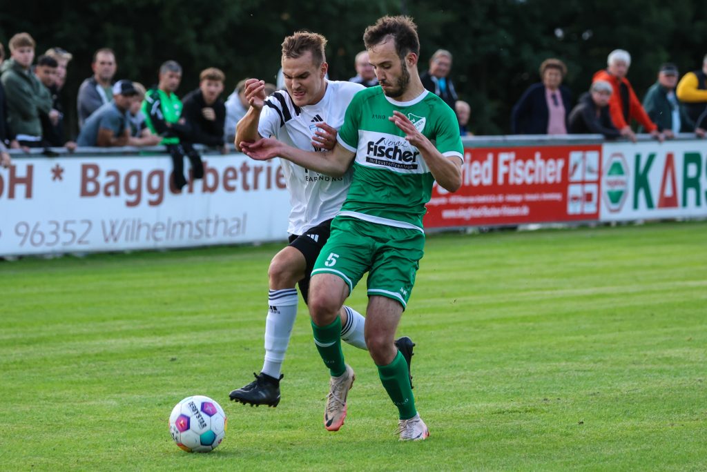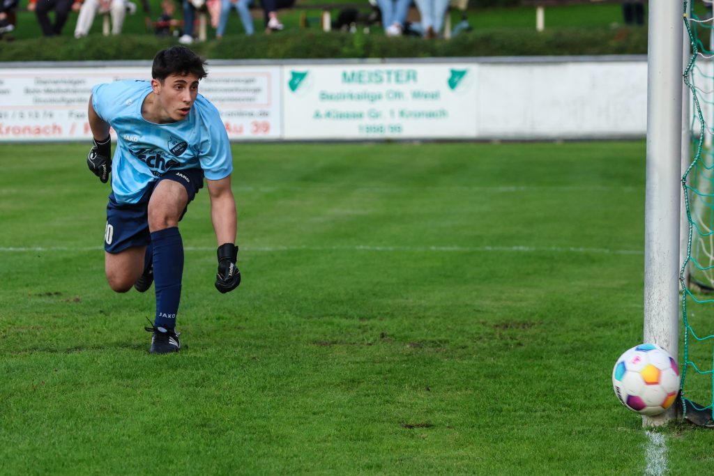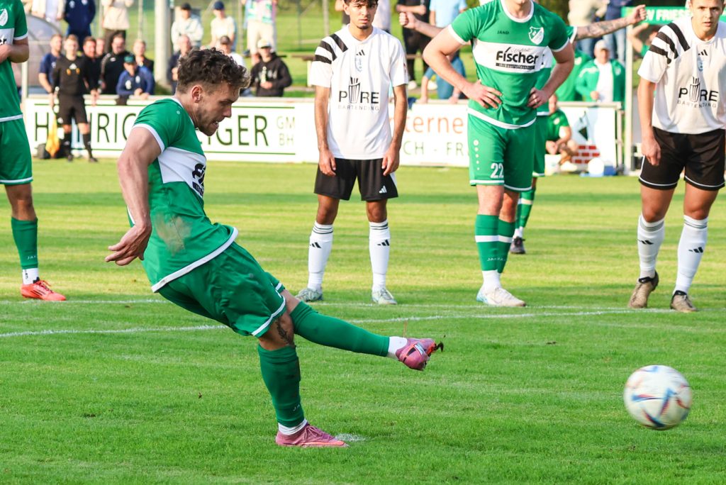 Den besseren und engagierteren Start in die Partie erwischten auch die Grün-Weißen, denen allerdings bereits nach fünf Minuten ein vermeintliches Abseitstor von Max Schülein aberkannt wurde. Aber auch im weiteren Verlauf der ersten Halbzeit waren es Schorn, Bachinger, Baier & Co., die sich mit teilweise gutem Kombinationsfußball einige Chancen erarbeiten konnten. Die Erlösung folgte schließlich in der 37. Spielminute. Nachdem sich Maxi Graf robust im Zweikampf gegen seinen Gegenspieler durchsetzen konnte, konnte selbiger ihn im Strafraum nur noch mit einem Foul stoppen. Den berechtigten Elfmeter verwandelte Noah Schorn souverän zur zu diesem Zeitpunkt absolut verdienten 1:0 Führung.